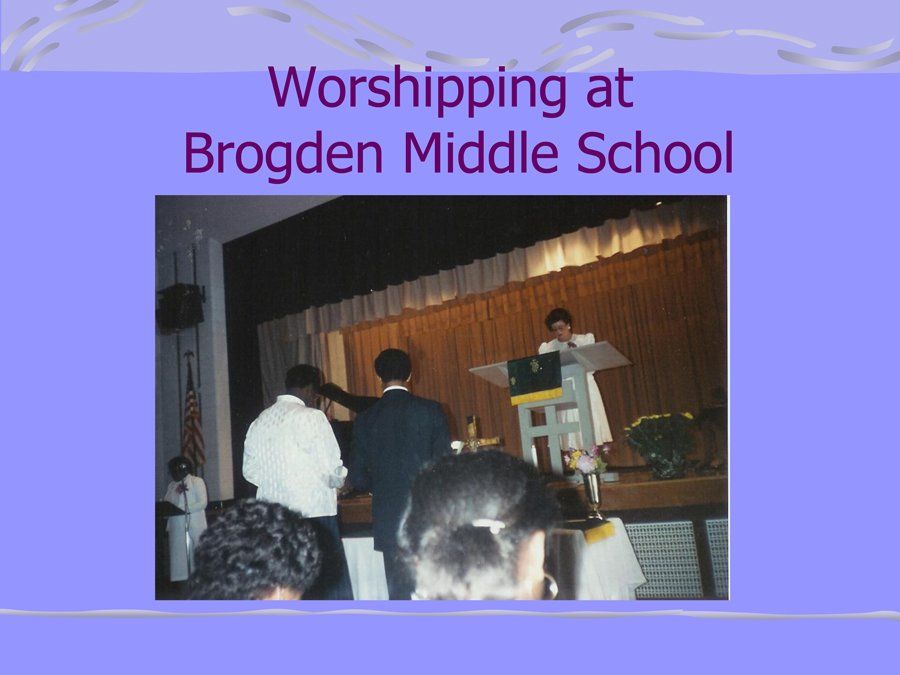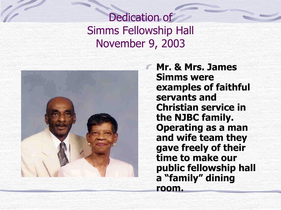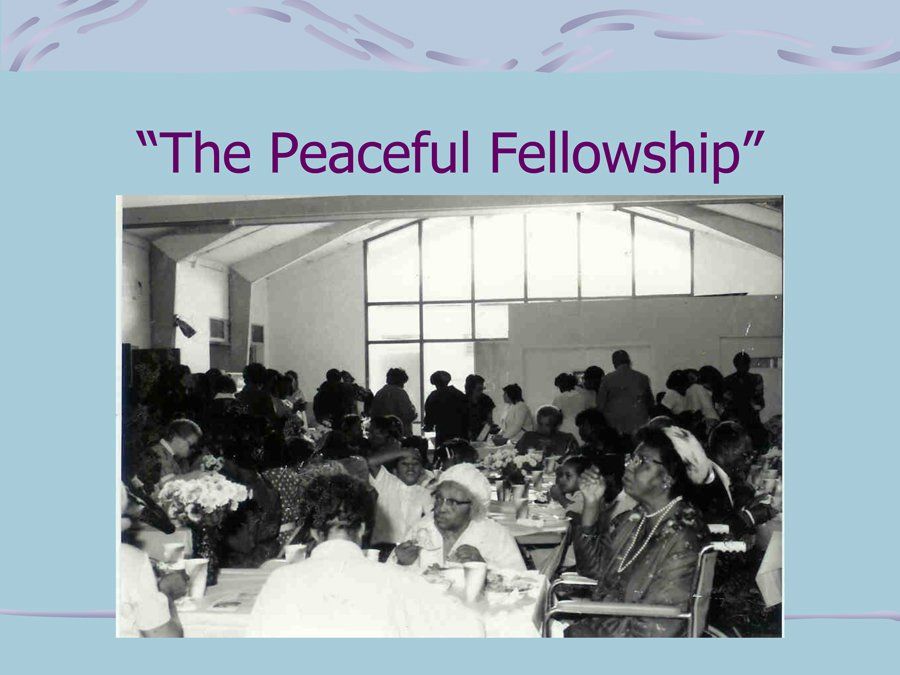 New Jerusalem worshiped for four years in the West Durham Recreation Center located at the corner of Hillsborough and Hillandale Roads. Bible Study and other meetings were held in the homes of the church members. We enjoyed worshiping at the West Durham Center because of the beautiful and tranquil scene that was presented by the large glass panel wall located behind the pulpit area and looked out over pine sweet gum and oak trees snuggled around the city's quiet, lake-like reservoir. We began to call ourselves the "Peaceful Fellowship" because of the beautiful and quieting effect that the outside pastoral scene had on our worship services. The beautiful stained glass window with the "Holy Ghost Dove" descending located above the pulpit area, is placed there as a constant reminder of our peaceful and spiritual fellowship experienced at the old place of worship.